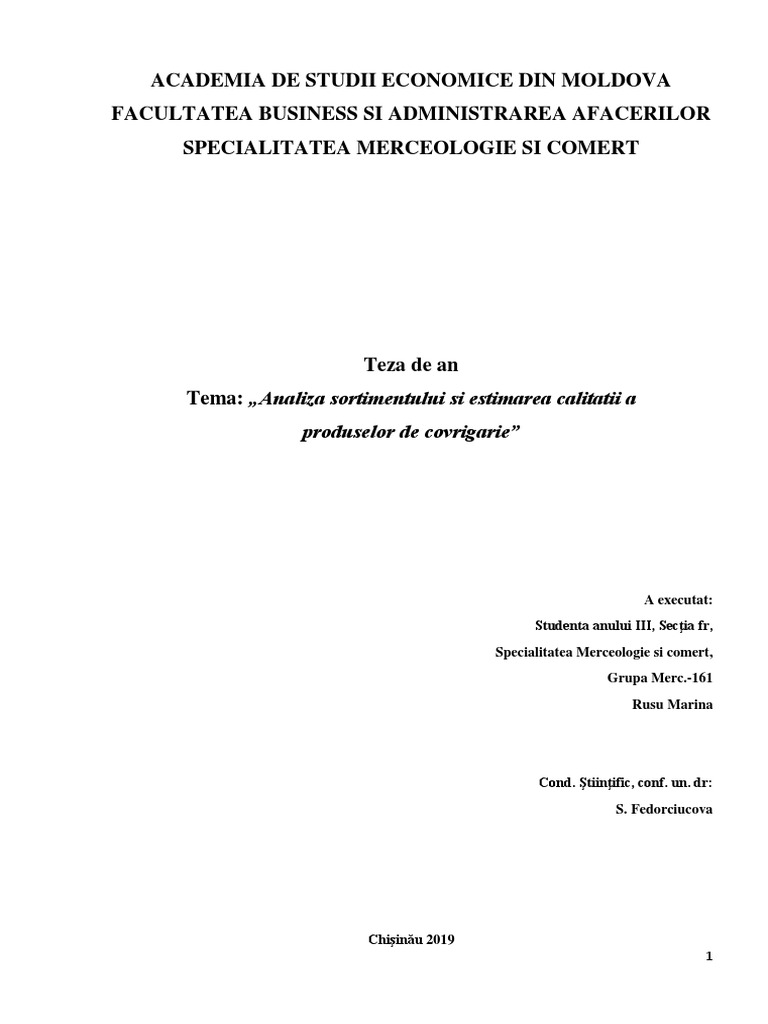 Tema: „Analiza sortimentului si estimarea calitatii a