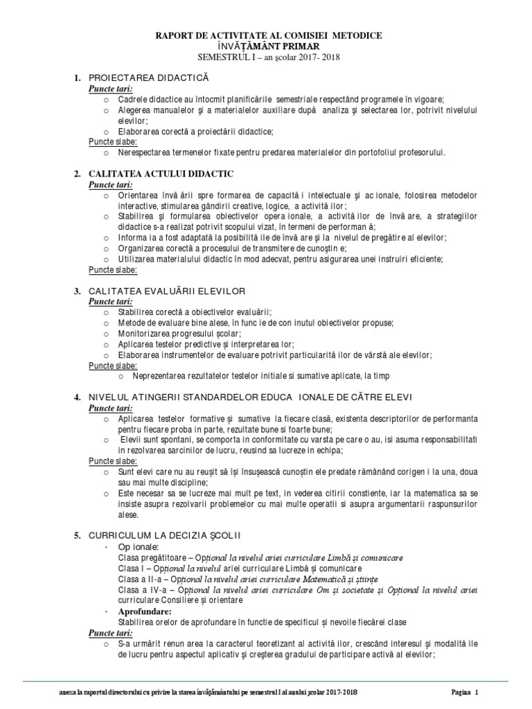 RAPORT DE ACTIVITATE AL COMISIEI METODICE