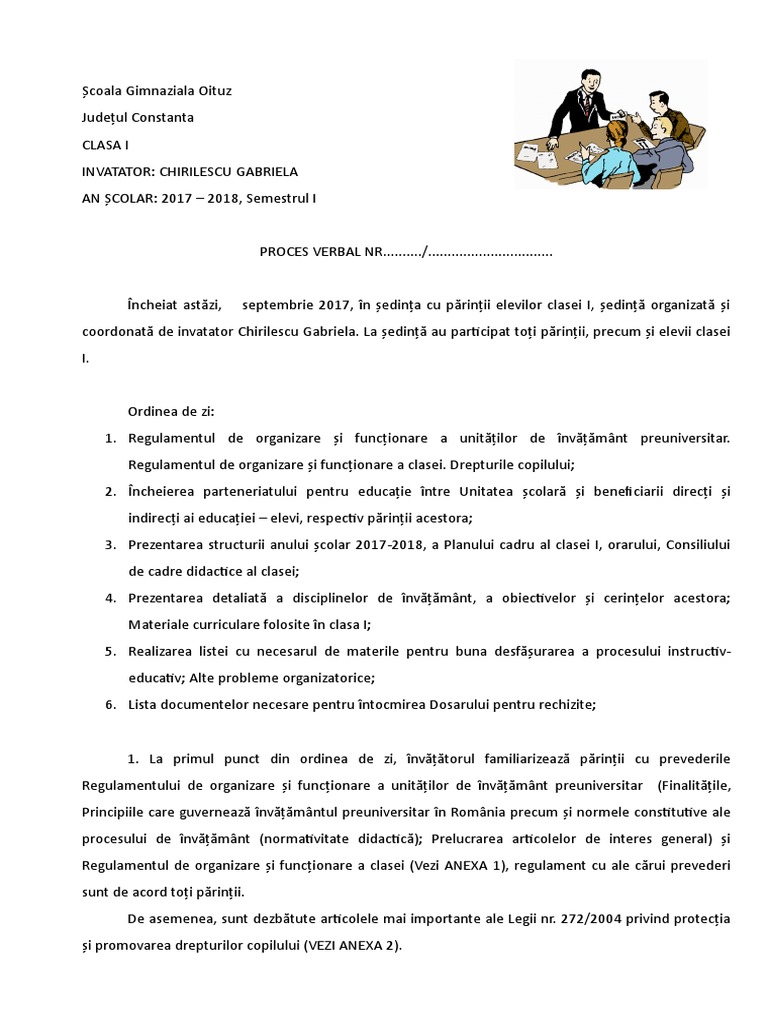 Încheiat astăzi, septembrie 2017, în şedinţa cu părinţii elevilor clasei I, şedinţă organizată şi
