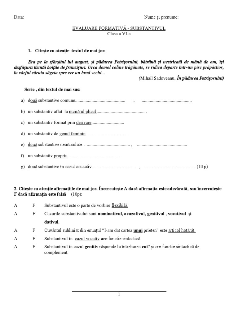 EVALUARE FORMATIVĂ - SUBSTANTIVUL
