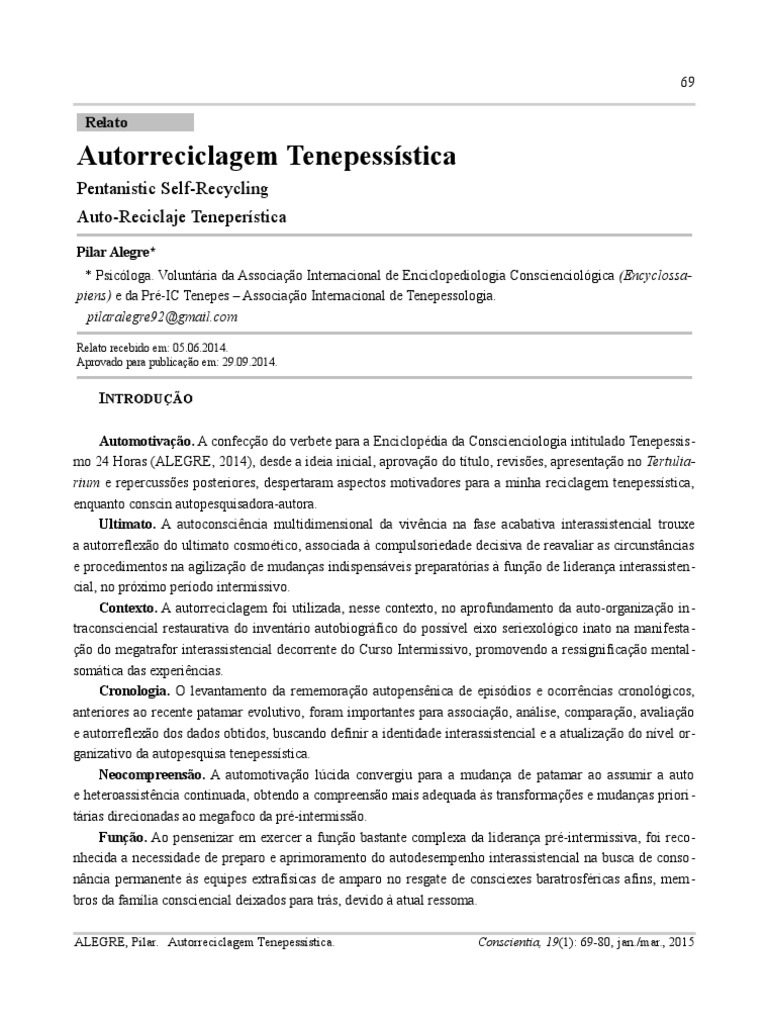 ALEGRE, Pilar. Autorreciclagem Tenepessística. Conscientia, 19(1): 69-80, jan./mar., 2015