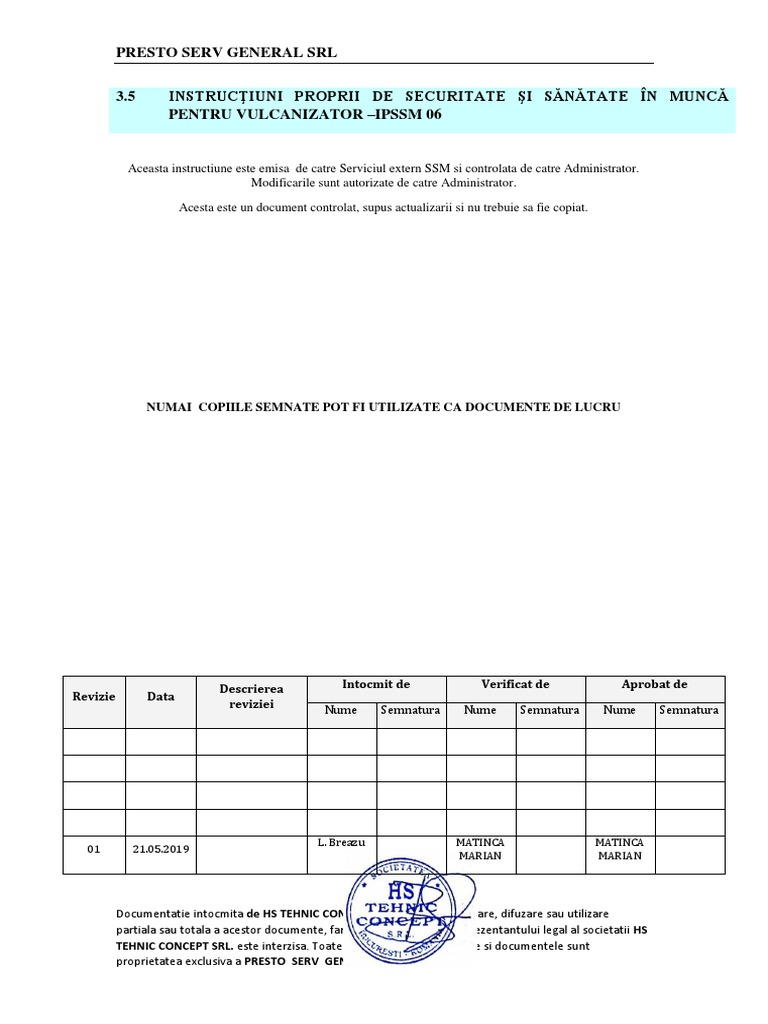 Aceasta instructiune este emisa de catre Serviciul extern SSM si controlata de catre Administrator.