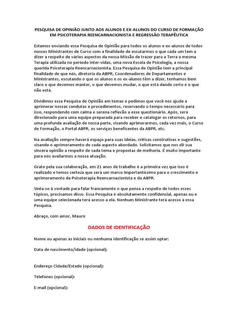 1.Você é ( ) Psicoterapeuta Reencarnacionista formado ( ) Aluno em formação ( )