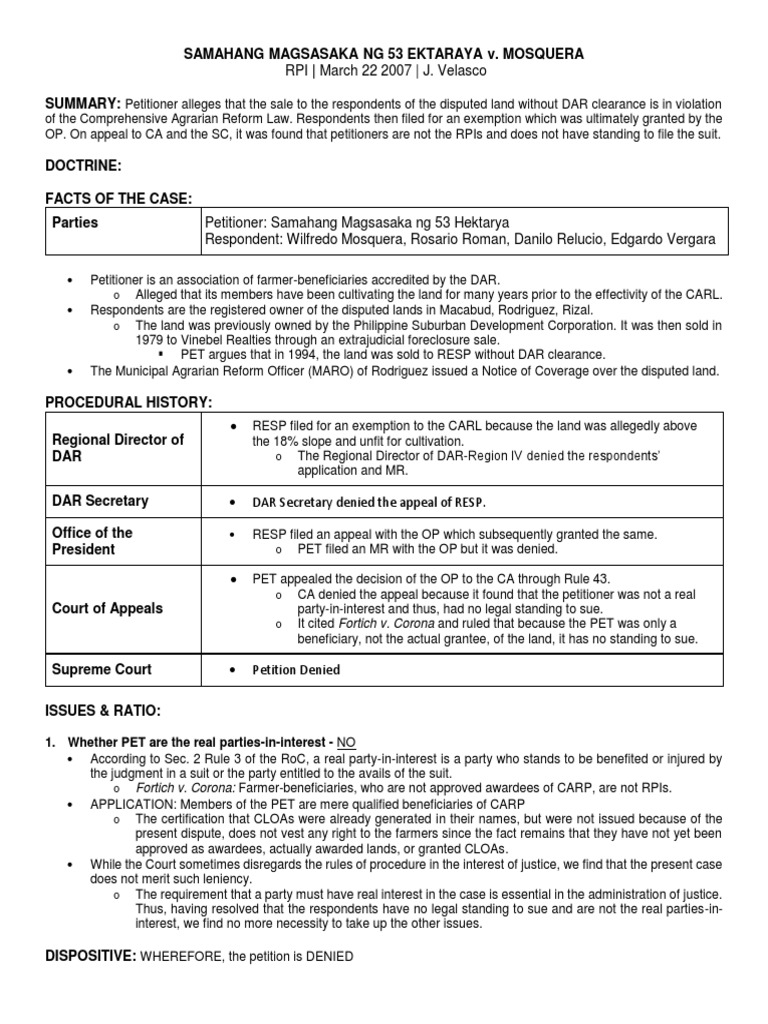 o Fortich v. Corona: Farmer-beneficiaries, who are not approved awardees of CARP, are not RPIs.