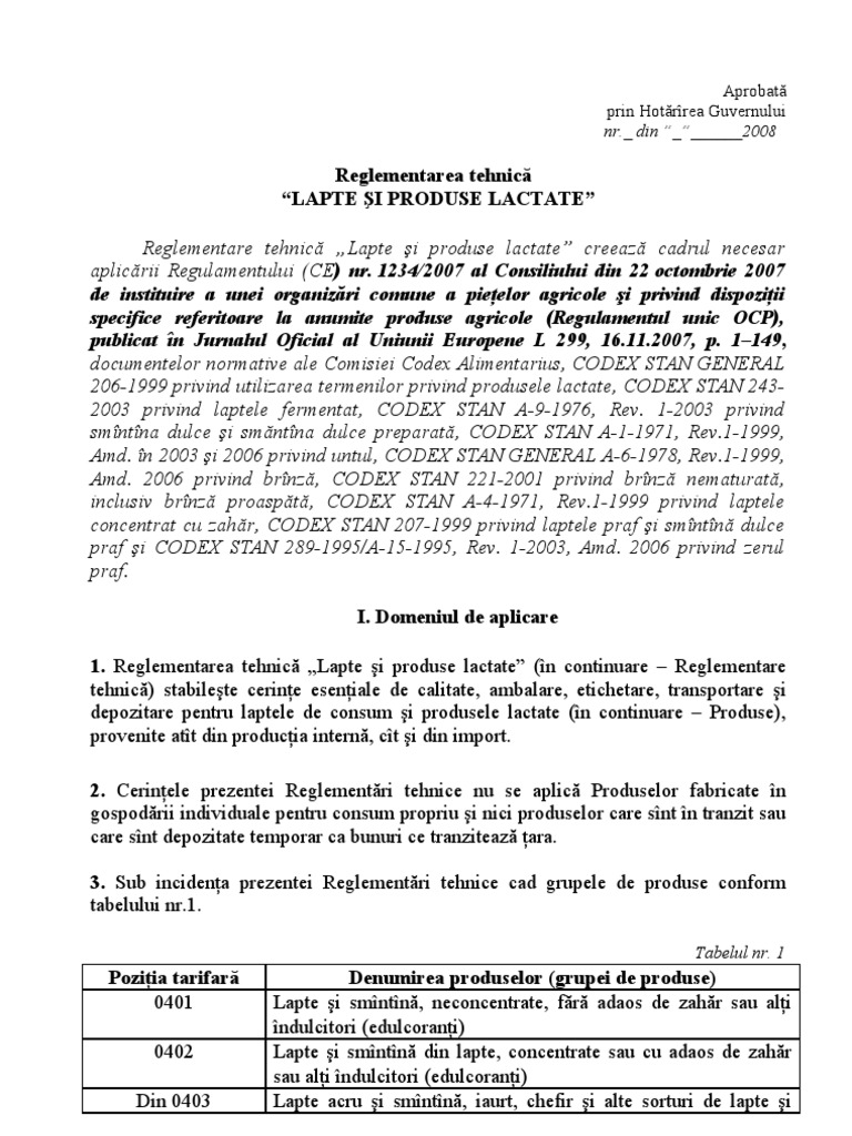produselor lactate cu sau fără adăugarea apei potabile şi cu caracteristici a produsului