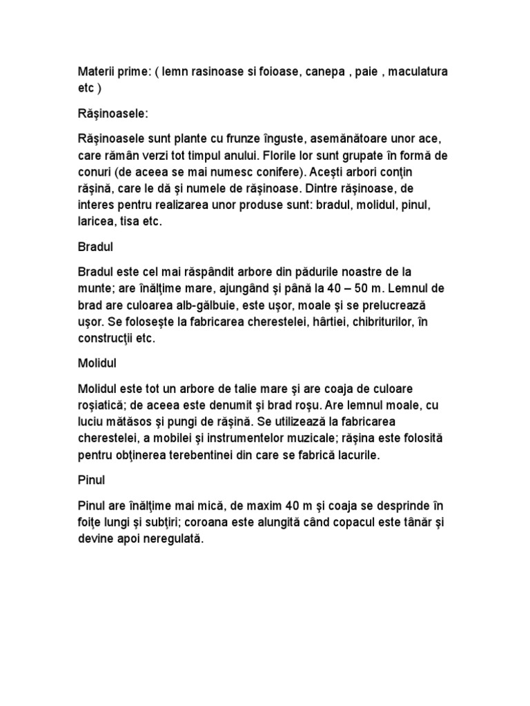 Materii prime: ( lemn rasinoase si foioase, canepa , paie , maculatura