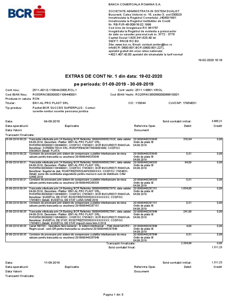 RO53RNCB0300001106440001; CODFISC 17954031; BCR BUCURESTI RAHOVA- 20.09.2019