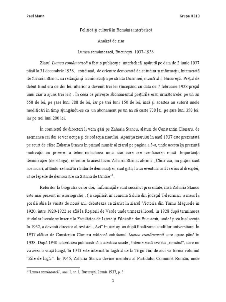 ”Lumea românească”, anul I, nr. I, București, 2 iunie 1937, p. 3.