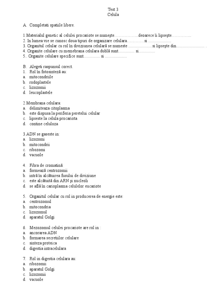 3. Organitul celular cu rol în diviziunea celulară se numeste ......................si lipseşte din.......................... .