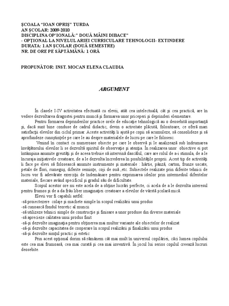 DISCIPLINA OP’IONALĂ:” DOUĂ MÂINI DIBACE”
