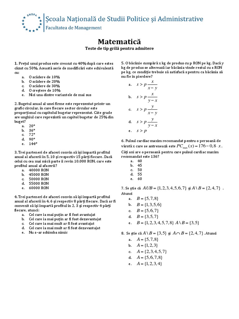 e. 60000 RON 7. Se știe că AUB = {1, 2,3, 4,5,6,7} și A \ B = {2, 4,7} .