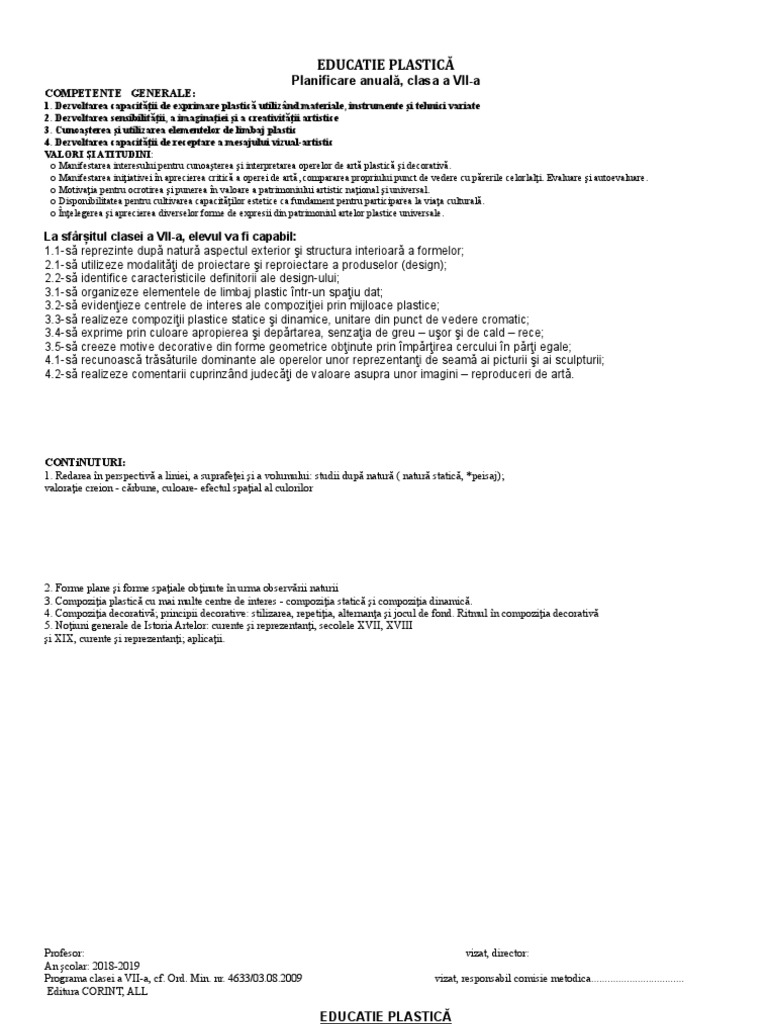 Planificarea orelor de educaţie plastică pe semestrul I-II, clasa a VII-a