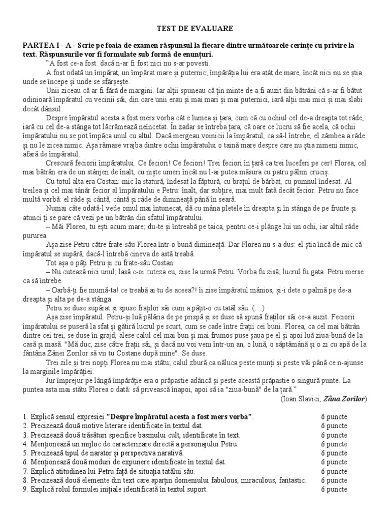 3. Precizează două trăsături specifice basmului cult, identificate în text. 6 puncte
