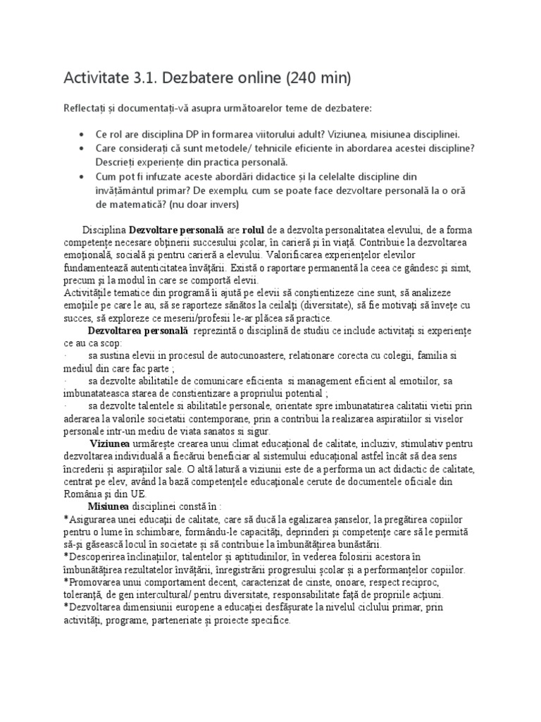 Disciplina Dezvoltare personală are rolul de a dezvolta personalitatea elevului, de a forma