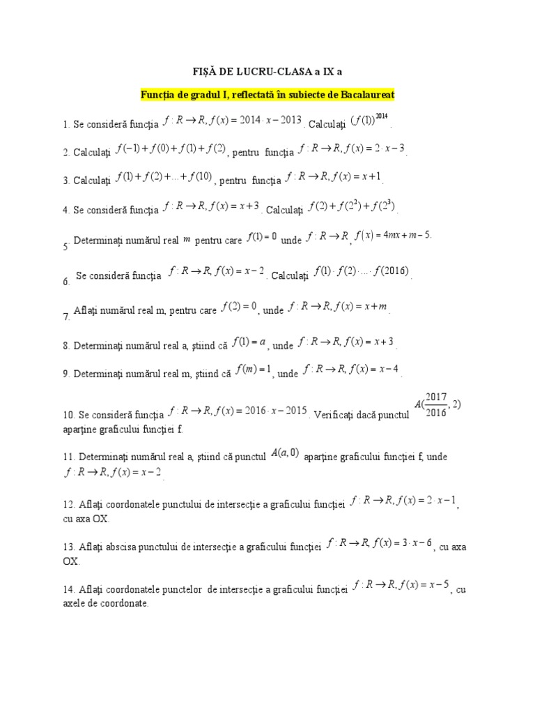 Funcţia de gradul I, reflectată în subiecte de Bacalaureat