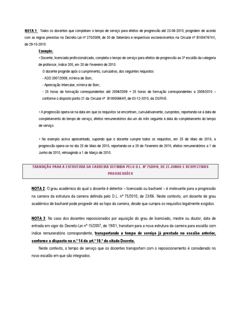 NOTA 1 : Todos os docentes que completam o tempo de serviço para efeitos de progressão até 23-06-2010, progridem de acordo
