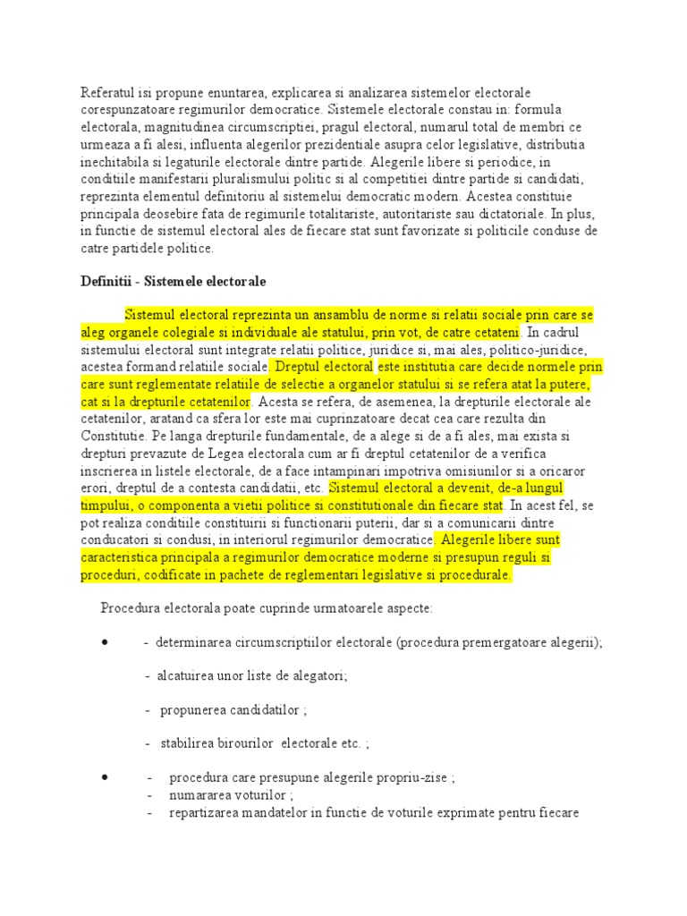 Referatul isi propune enuntarea, explicarea si analizarea sistemelor electorale
