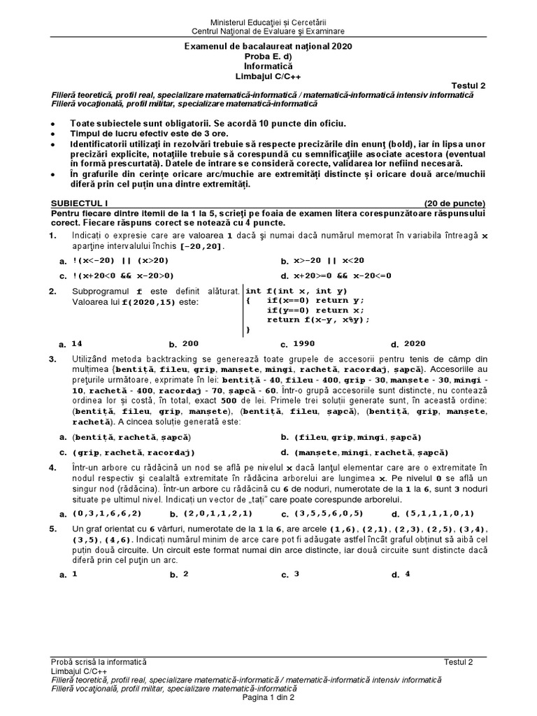 SUBIECTUL I (20 de puncte)