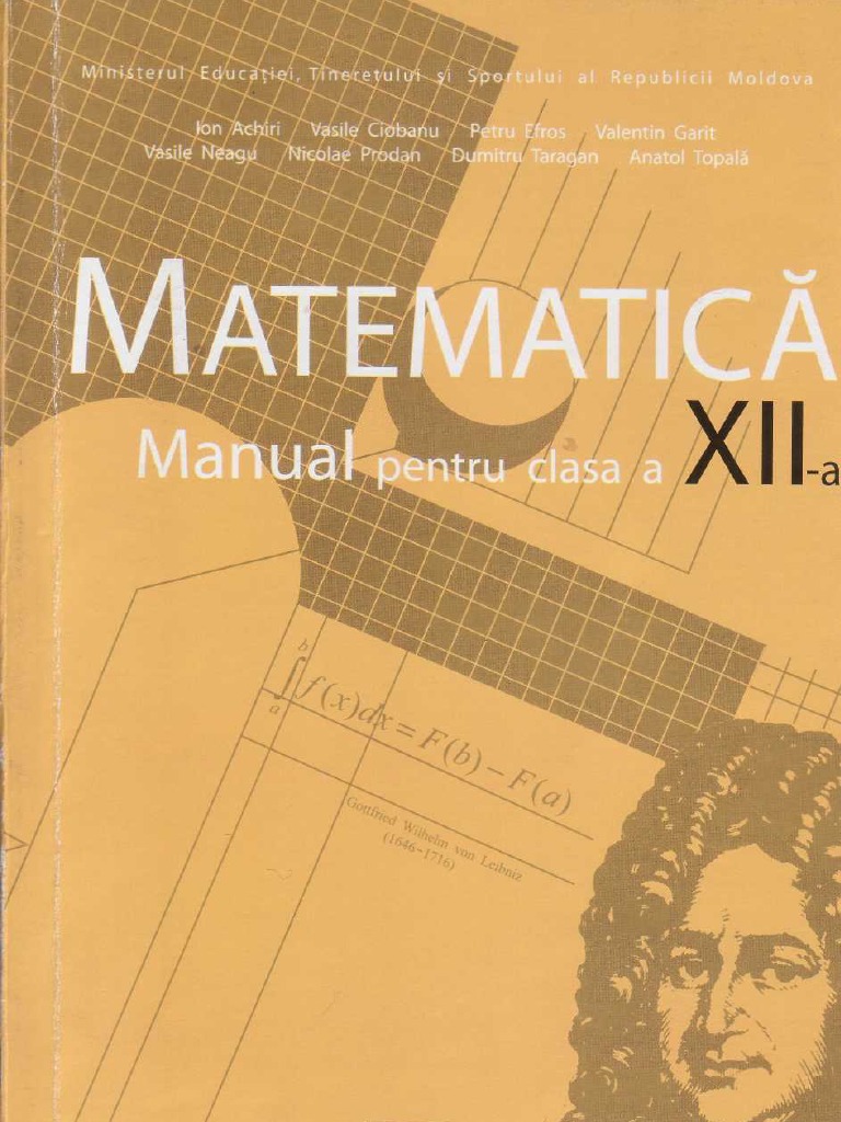 Avind aceeasi structurasi fiind 0 eontinnare a manualelor de matematicapentru clasele X-Xl (autoril. Achiri, V. Ciobanu ~.a.»pl'ezentul manual este elaborat 'in eonformitate eu curriculumul Iiceal in vigoare §i face posibil sa fie realizate prevederile eurriculare pentruclasaa XU-a. Manualul contine compartimente ce tin. de elemente de analiza matematica, elemente de algebra superioara si geometrie analitiea, Pentru orientate, lainceputul fiecarui capitol sint formulate obiectivele edueationale care porfi atinse studiind capitolul respectiv,