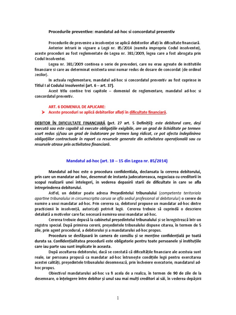 In actuala reglementare, mandatul ad-hoc si concordatul preventiv au fost cuprinse in