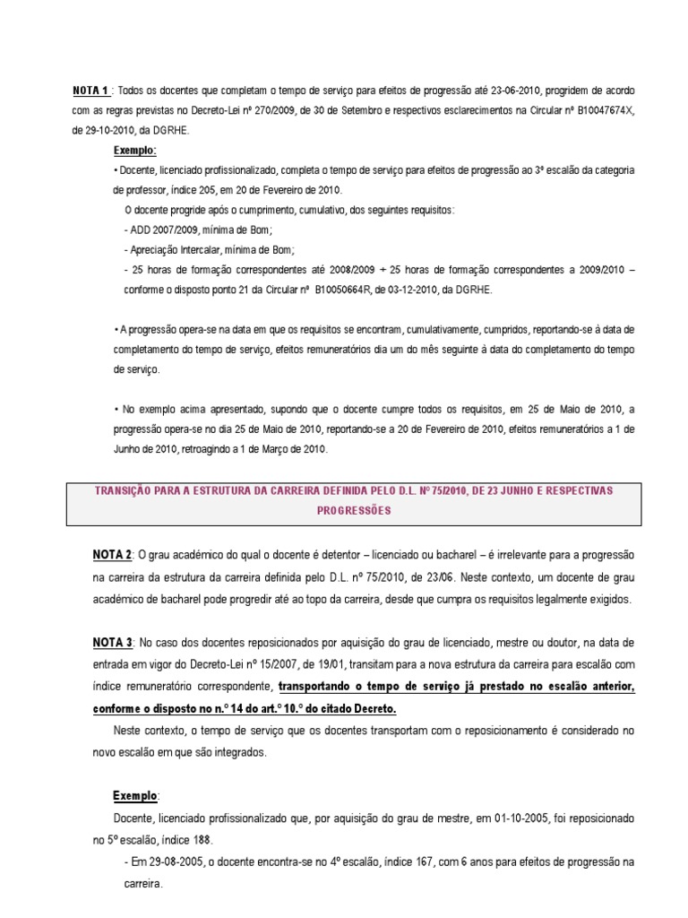 NOTA 1 : Todos os docentes que completam o tempo de serviço para efeitos de progressão até 23-06-2010, progridem de acordo