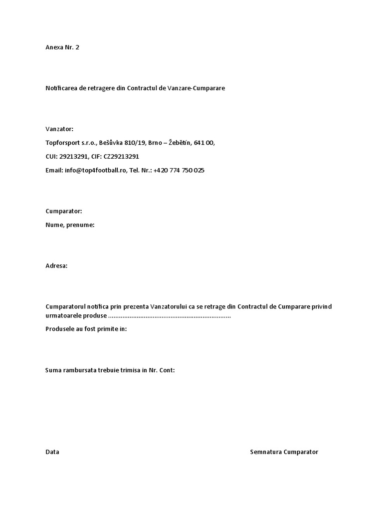 Cumparatorul notifica prin prezenta Vanzatorului ca se retrage din Contractul de Cumparare privind