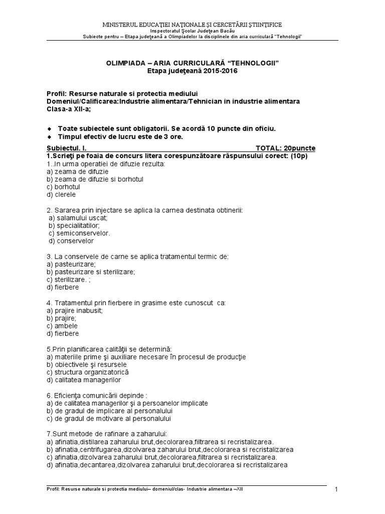 Subiecte pentru – Etapa judeţeană a Olimpiadelor la disciplinele din aria curriculară “Tehnologii”