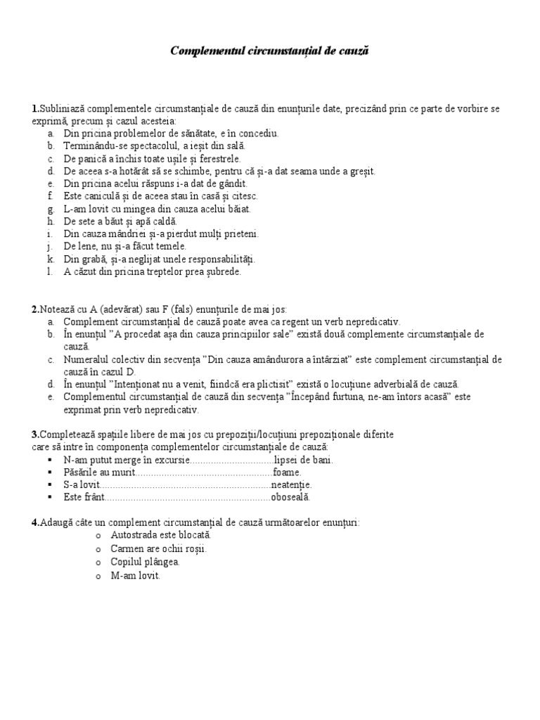 [Link]ă complementele circumstanțiale de cauză din enunțurile date, precizând prin ce parte de vorbire se