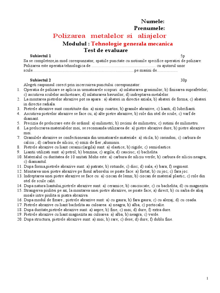 5. Precizia de prelucrare este de ordinul: a) milimetri; b) zecimi de milimetru; c) sutimi de milimetru.
