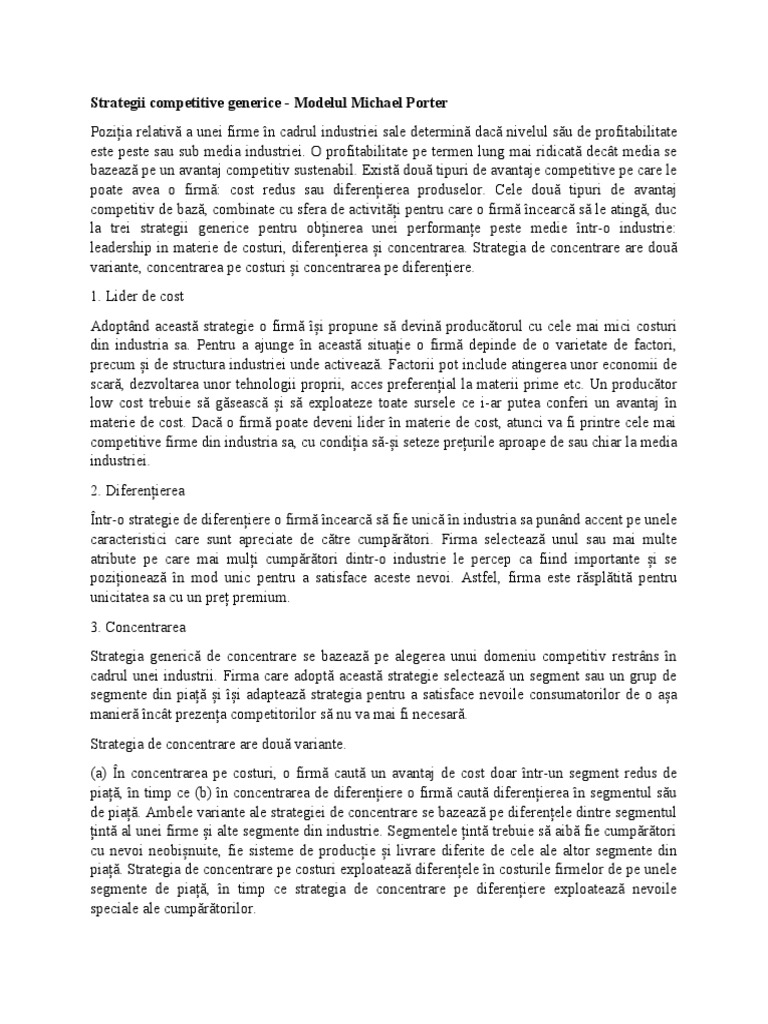 leadership in materie de costuri, diferențierea și concentrarea. Strategia de concentrare are două