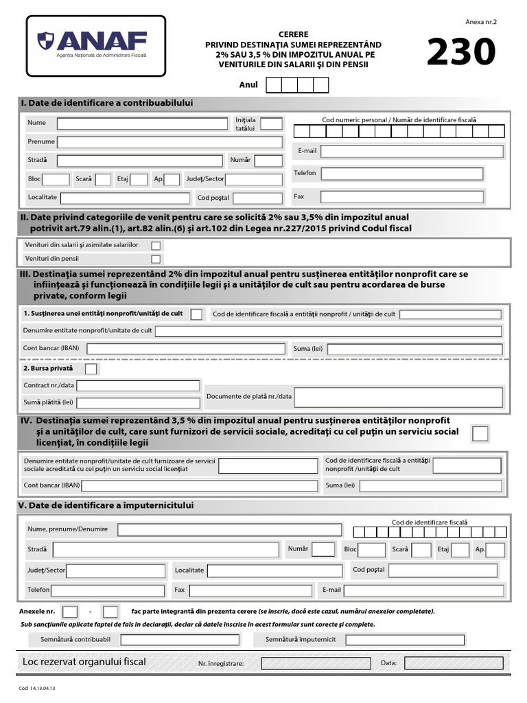 privind completarea formularului 230 "Cerere privind destinația sumei reprezentând 2% sau 3,5%