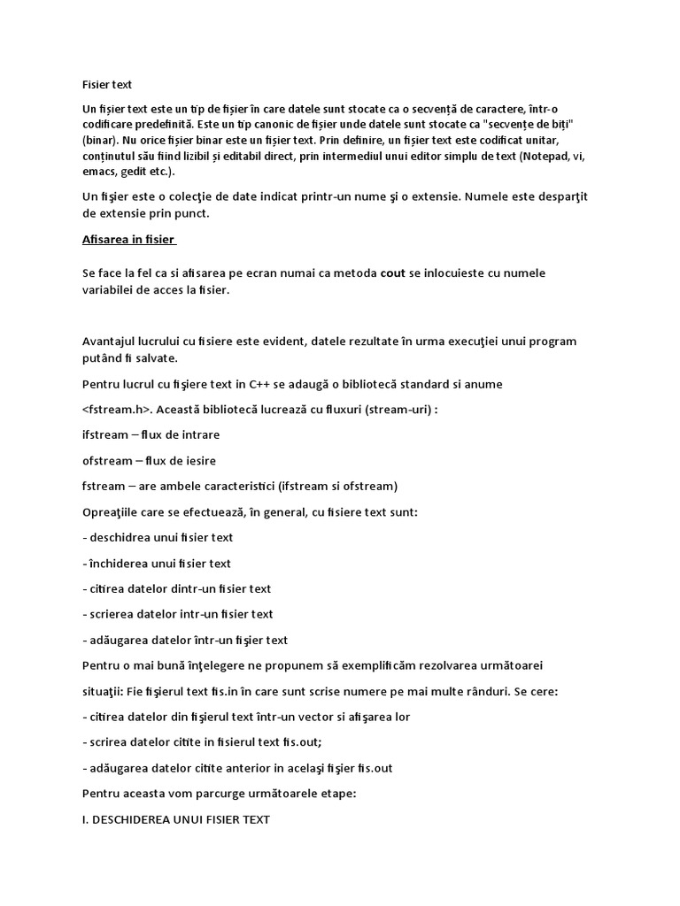 Un fișier text este un tip de fișier în care datele sunt stocate ca o secvență de caractere, într-o