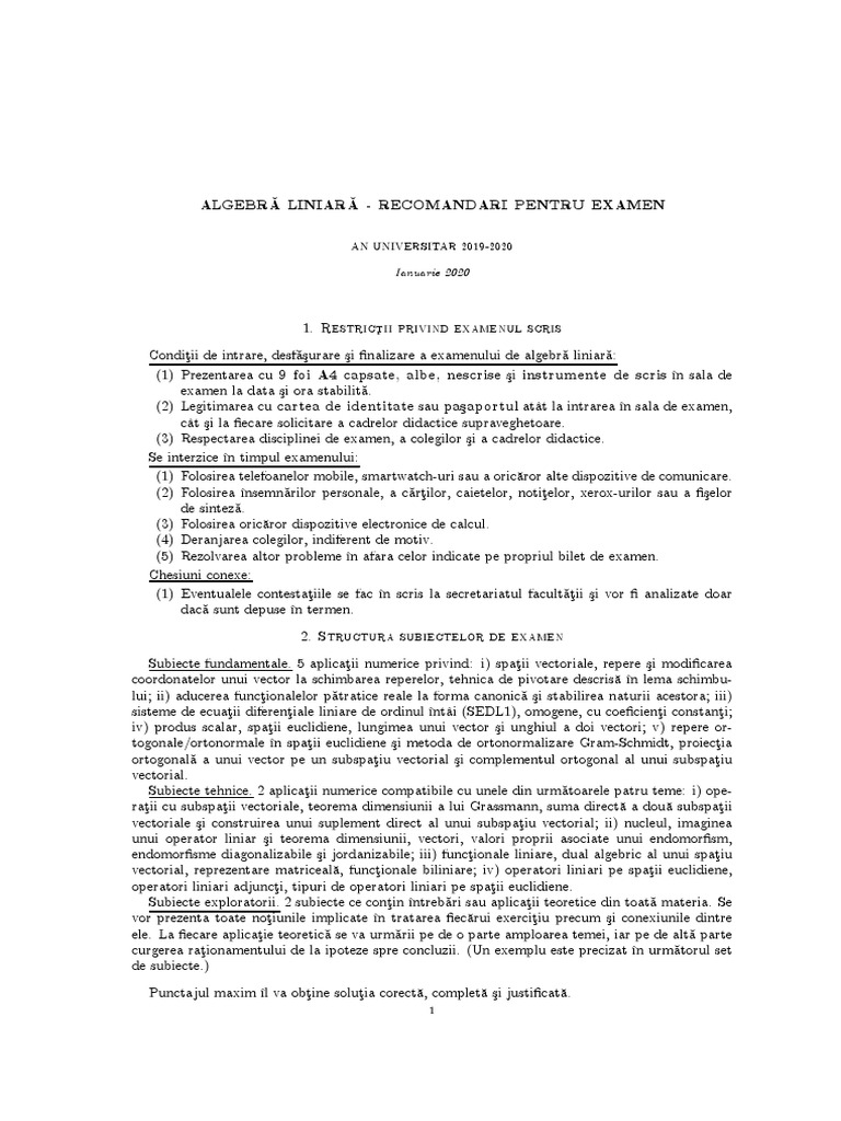 ALGEBRĂ LINIARĂ - RECOMANDARI PENTRU EXAMEN