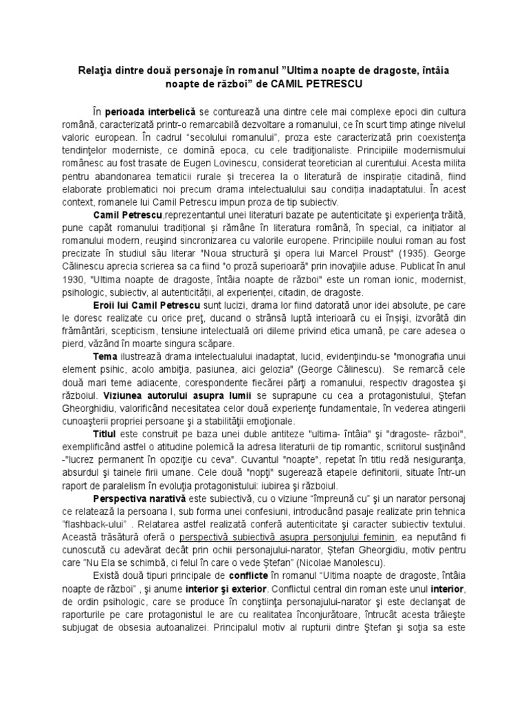 Relaţia dintre două personaje în romanul ”Ultima noapte de dragoste, întâia