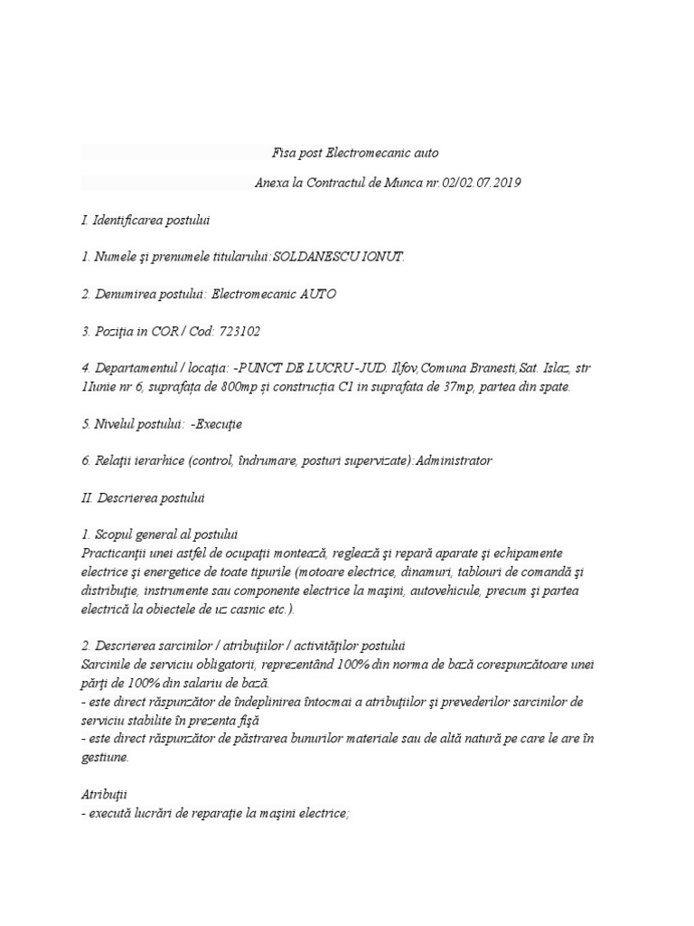 Anexa la Contractul de Munca nr.02/02.07.2019
