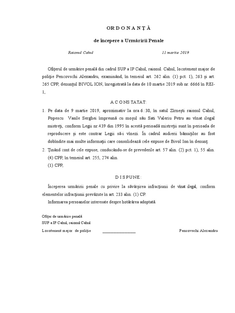 265 CPP, denunțul BIVOL ION, înregistrată la data de 10 martie 2019 sub nr. 6666 în REI-