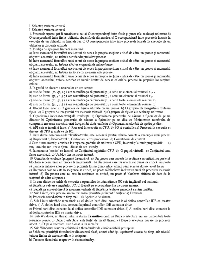 1. Procesele uşoare pot fi considerate ca: a) O corespondenţă între firele şi procesele aceluiaşi utilizator.b)