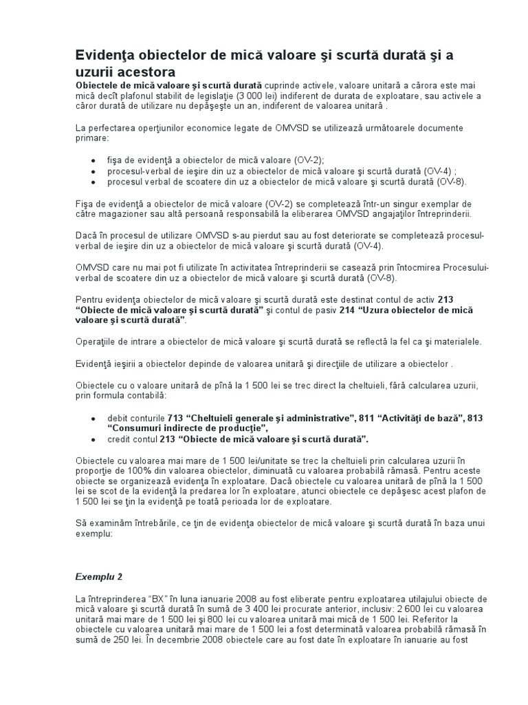 Obiectele de mică valoare şi scurtă durată cuprinde activele, valoare unitară a cărora este mai