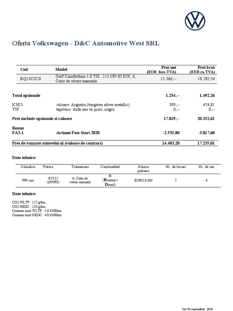 Pret inclusiv optionale si culoare 17.019,-- 20.252,61