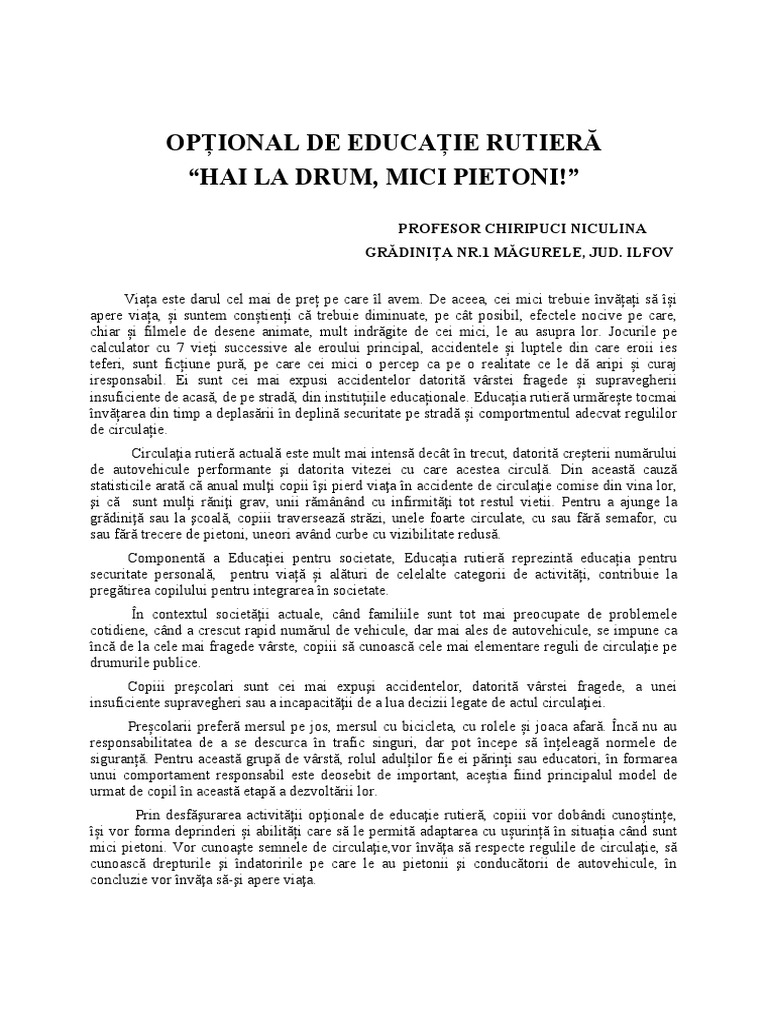 Prin desfăşurarea activităţii opţionale de educaţie rutieră, copiii vor dobândi cunoștințe,