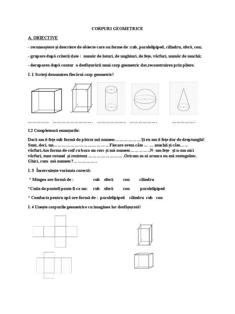 I. 1 Scrieți denumirea fiecărui corp geometric!