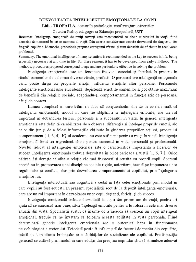 succes. Inteligenţa emoţională trebuie dezvoltată în orice perioadă a vieţii [1, 6, 7 ]. Orice