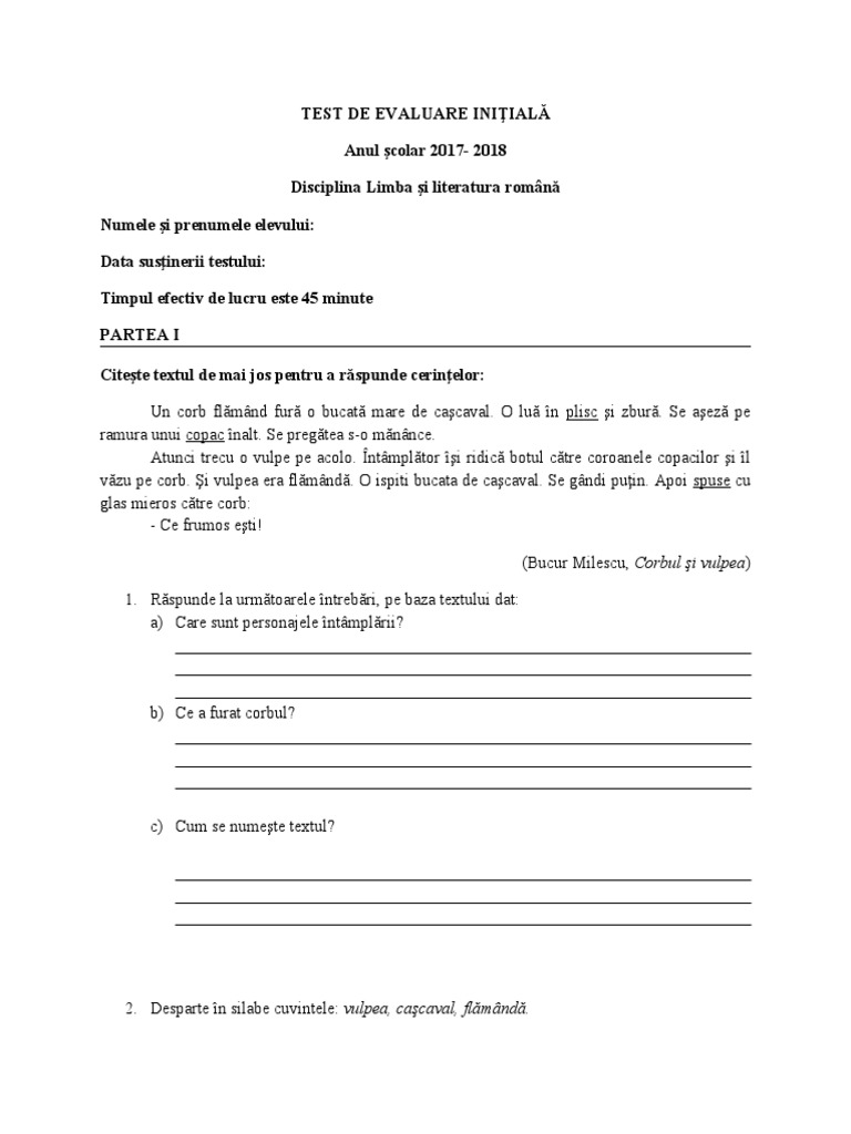 În cadrul probei scrise a evaluării inițiale la disciplina Limba și literatura românî, elevii clasei a