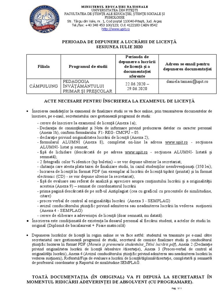 - cerere de înscriere la examenul de licenţă (Anexa 1a);