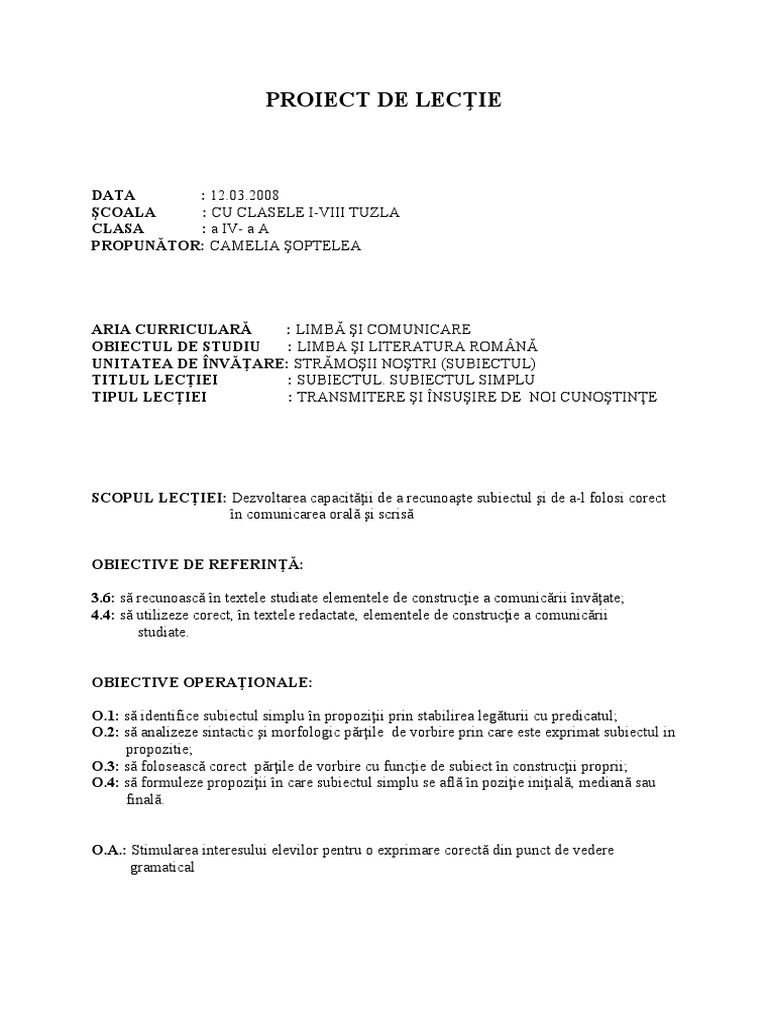 O.4: să formuleze propoziţii în care subiectul simplu se află în poziţie iniţială, mediană sau