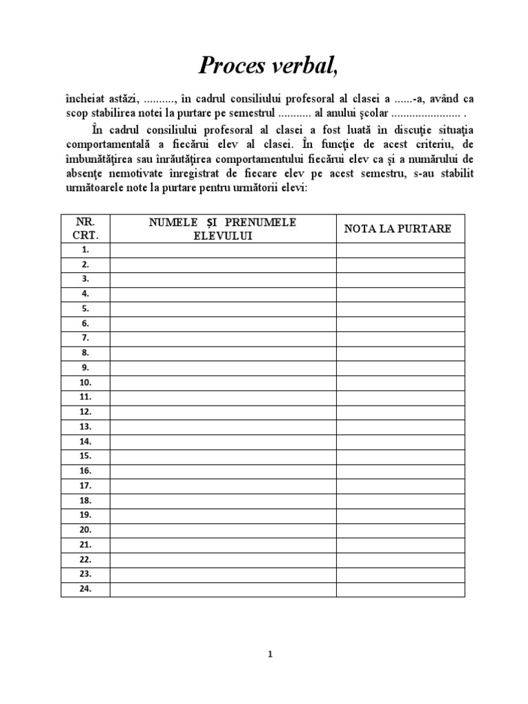 scop stabilirea notei la purtare pe semestrul ........... al anului şcolar ....................... .