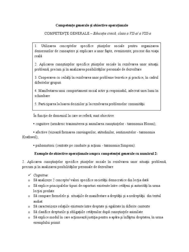 COMPETENŢE GENERALE – Educație civică, clasa a VII-a/ a VIII-a