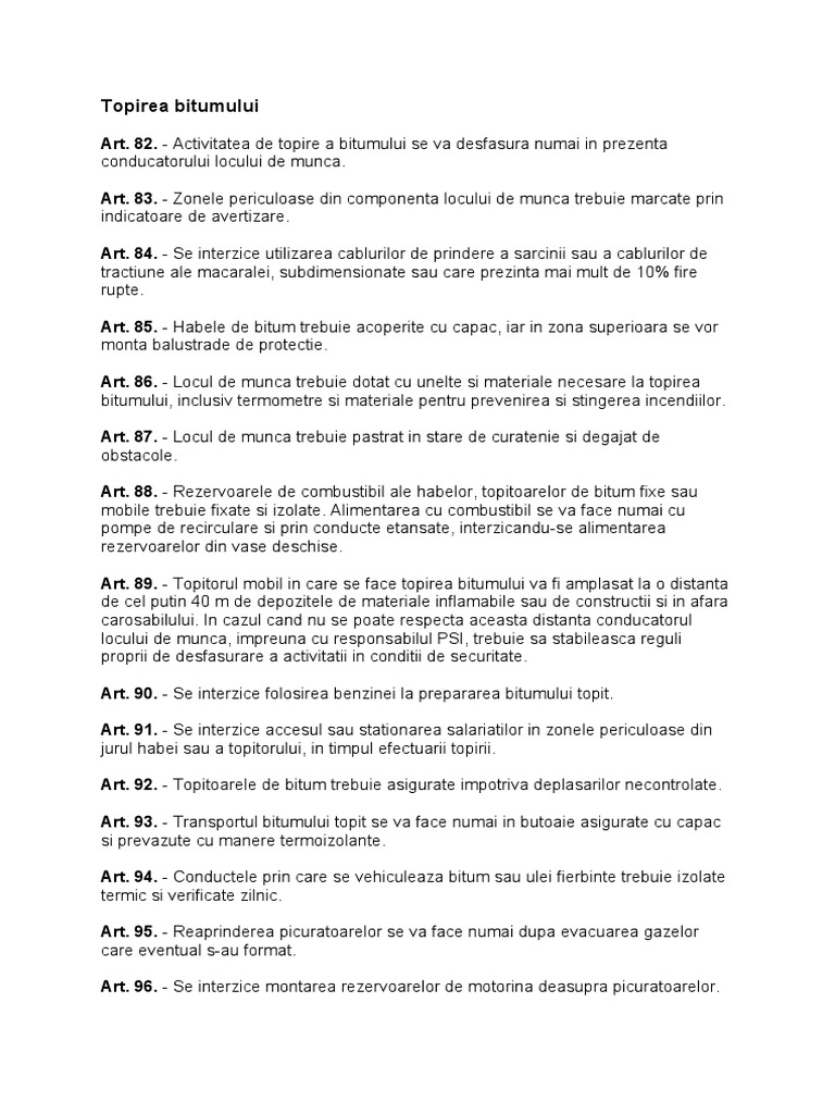 Art. 82. - Activitatea de topire a bitumului se va desfasura numai in prezenta