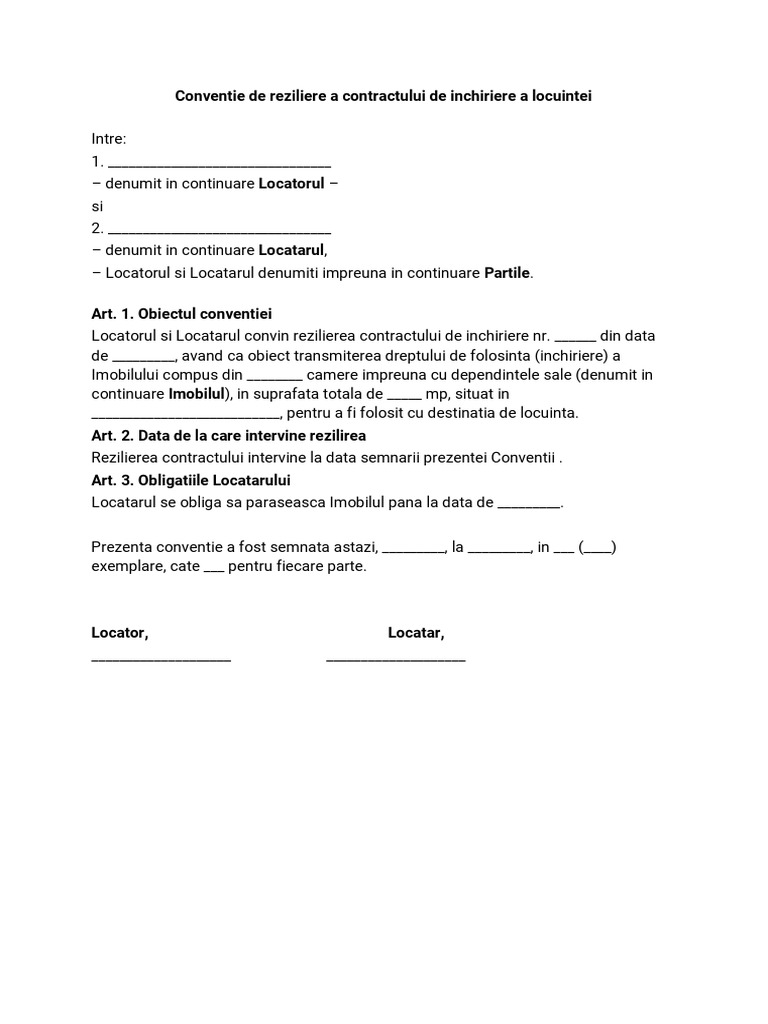 Conventie de reziliere a contractului de inchiriere a locuintei