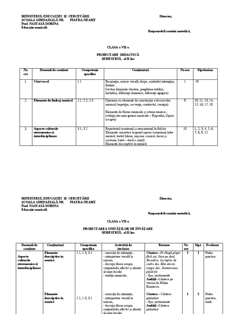 Elemente 1.1, 1.3, 3.1 - exerciţii de intonaţie; Cântece –Pe lângă plopii 1 1 Probe